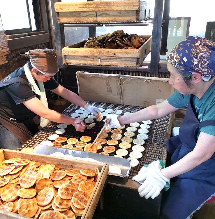 ・普通の堅焼きを作るように丸いうるち米生地を備長炭火で丹念に焼き上げた後、敢えて生地を割っております。そうすると生地の割れた断面から醤油が染み込み、普通の堅焼きとは一層味わいが違う堅焼きが極われとなります。生地の食感も楽しんで頂きたくお米を少し粗く挽いた生地となっております。