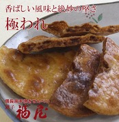 香ばしい風味と絶妙の堅さ「極われ」。備長炭の炭火で一枚一枚心を込めて手焼きしたせんべいを、あえて半分に割って醤油に浸し味をしみ込ませます。せんべいを醤油に浸した瞬間、湯気が立ち「じゅわっ」という音と共に香ばしい匂いが立ち込めます。割れた部分にも醤油が浸み込んで、香ばしい醤油の香りが口の中に広がります。江戸時代から始まった伝統ある銚子の醤油作りと福屋のこだわりが見事にマッチングしたおせんべいです。