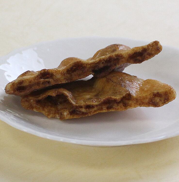 ・普通の堅焼きを作るように丸いうるち米生地を備長炭火で丹念に焼き上げた後、敢えて生地を割っております。そうすると生地の割れた断面から醤油が染み込み、普通の堅焼きとは一層味わいが違う堅焼きが極われとなります。生地の食感も楽しんで頂きたくお米を少し粗く挽いた生地となっております。