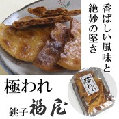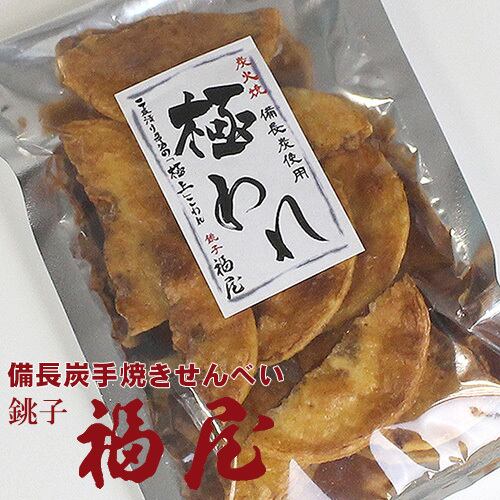 香ばしい風味と絶妙の堅さ「極われ」。備長炭の炭火で一枚一枚心を込めて手焼きしたせんべいを、あえて半分に割って醤油に浸し味をしみ込ませます。せんべいを醤油に浸した瞬間、湯気が立ち「じゅわっ」という音と共に香ばしい匂いが立ち込めます。割れた部分にも醤油が浸み込んで、香ばしい醤油の香りが口の中に広がります。江戸時代から始まった伝統ある銚子の醤油作りと福屋のこだわりが見事にマッチングしたおせんべいです。