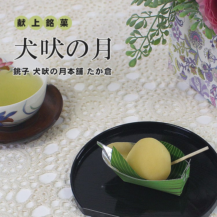 「犬吠の月」は、吟味した大粒栗をねりきりあんで包み、風味豊かに仕上げた銘菓です。犬吠の海に浮かぶ舟から見る月に見立てた、風情のある逸品をご賞味下さい。昭和47年に昭和天皇銚子行幸の折り、お召し上がり賜りました銘菓です。